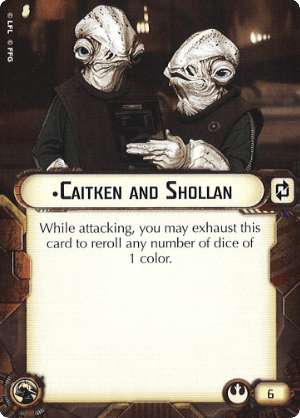 After rolling your initial attack pool, you may choose during “Resolve Attack Effects” to exhaust Caitken and Shollan and select a dice of 1 color (Red, Blue, or Black) you currently have in your pool and reroll any number of the selected color.