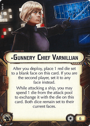 After a ship equipped with Gunnery Chief Varnillian is deployed, place 1 red die on this card. If you are 1st player, that die is set to a black face. If you are 2nd player, that die is set to any face of your choice.