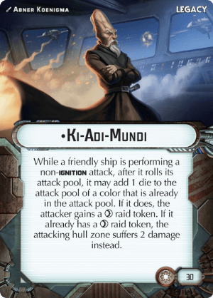 While a friendly ship is performing a non-ignition attack, after it rolls its attack pool, it may add 1 die to the attack pool of a color that is already in the attack pool. If it does, the attacker gains a raid token. If it already has a raid token, the attacking hull zone suffers 2 damage instead.
