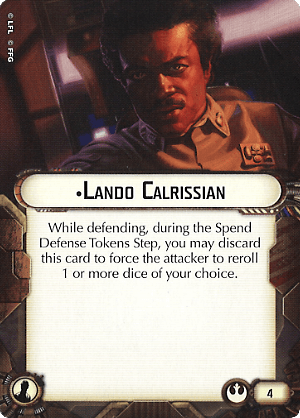 When a ship equipped with Lando Calrissian is attacked, in the “Spend Defense Tokens” step, you may discard this card. If you do, force the attacker to reroll 1 or more dice of your choice.