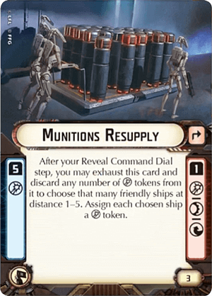 After the “Reveal Command Dial” step, a ship equipped with Munitions Resupply may exhaust this card and choose up to 5 friendly ships (including itself) at distance 1-5 to gain a Concentrate Fire token. For each ship that gains a Concentrate Fire token, discard a Concentrate Fire token from this card.