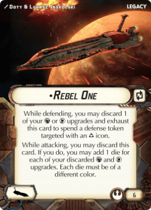 While defending, you may discard 1 of your or upgrades and exhaust this card to spend a defense token targeted with an icon.