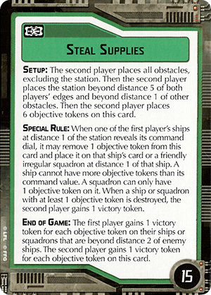 Special Rule: When one of the first player’s ships at distance 1 of the station reveals its command dial, it may remove 1 objective token from this card and place it on that ship’s card or a friendly irregular squadron at distance 1 of that ship. A ship cannot have more objective tokens than its command value. A squadron can only have 1 objective token on it. When a ship or squadron with at least 1 objective token is destroyed the second player gains 1 victory token.